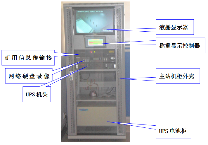 主站安裝在機(jī)房或調(diào)度室,其中不間斷電源用于向系統(tǒng)提供電源,在監(jiān)控室停電情況下,不間斷電源可維持系統(tǒng)運(yùn)行4小時(shí)。接口用于接收分站傳來的數(shù)據(jù)包,并對(duì)該數(shù)據(jù)包進(jìn)行處理,然后發(fā)送給稱重顯示控制器,稱重顯示控制器將接口傳輸來的實(shí)時(shí)數(shù)據(jù),進(jìn)行顯示,并通過煤炭專網(wǎng)進(jìn)一步上傳到監(jiān)控服務(wù)器。在主站旁安裝一臺(tái)吸頂球形攝像頭,用于監(jiān)控主站的工作情況,其監(jiān)控畫面和由安裝在現(xiàn)場的隔爆攝像儀傳送回來的監(jiān)控畫面由網(wǎng)絡(luò)硬盤錄像機(jī)統(tǒng)一管理。監(jiān)控中心可通過網(wǎng)絡(luò)直接訪問網(wǎng)絡(luò)硬盤錄像機(jī)中的監(jiān)控錄像。